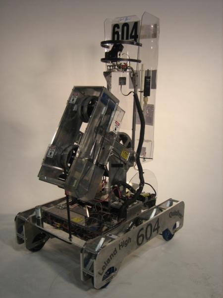 | Concept: | Shortly after the 2013 Kickoff, 604 quickly recognized that the robot needed to quickly score Frisbees and reload from both the ground and feeder stations. With the emphasis on accurate scoring, every shot needed to be taken quickly and as accurately as possible, regardless of the position on the field or when under heavy defense. The robot needed to be short enough to maneuver under the pyramid to pickup frisbees during autonomous. Silverbolt is able to accomplish all of these with a camera tracking system to nearly make 100% of all shots. In addition, Silverbolt a 120 degree vertically rotatable shooter to adjust to the optimal position to score. Furthermore, Silverbolt has a low mounted shooter to fit underneath the pyramid and also has the ability to hang at the first level. |